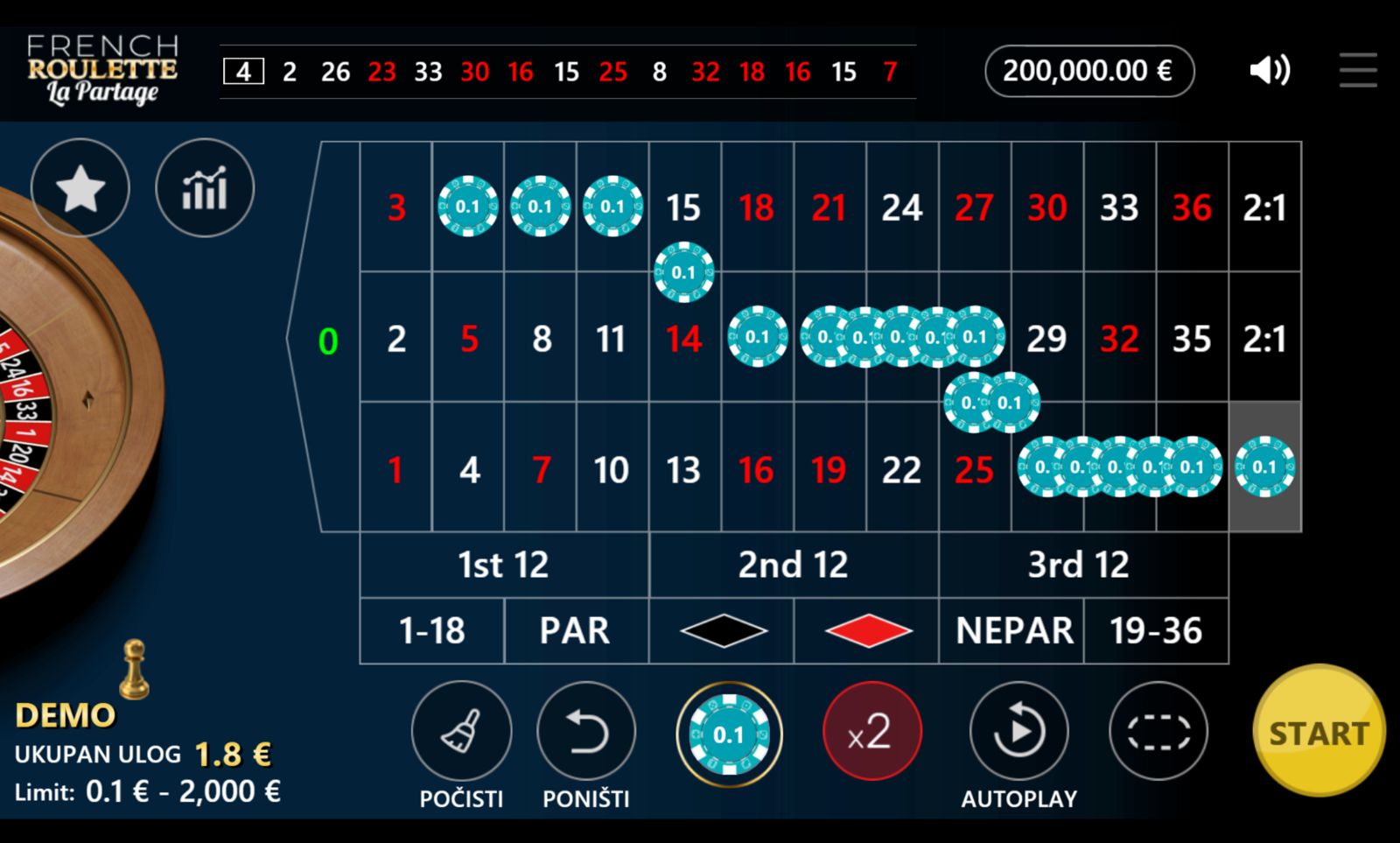 Dobrodošli u sofisticirani svijet vrhunske rulet zabave! FRENCH ROULETTE – LA PARTAGE dolazi od providera XGames i donosi klasičnu francusku verziju ruleta s pravilom La Partage koje igračima pruža dodatnu prednost. Minimalni ulog iznosi 0,10 €, dok maksimalni doseže 2000,00 €, što igru čini privlačnom za sve – od početnika do iskusnih high rollera. Igra nema jackpot, ali zahvaljujući povoljnijim pravilima i nižoj kućnoj prednosti, svaki spin nudi veće šanse za solidne dobitke. Ako voliš elegantne, strateške i matematički najpovoljnije rulet varijante — FRENCH ROULETTE – LA PARTAGE je savršen izbor za tebe!