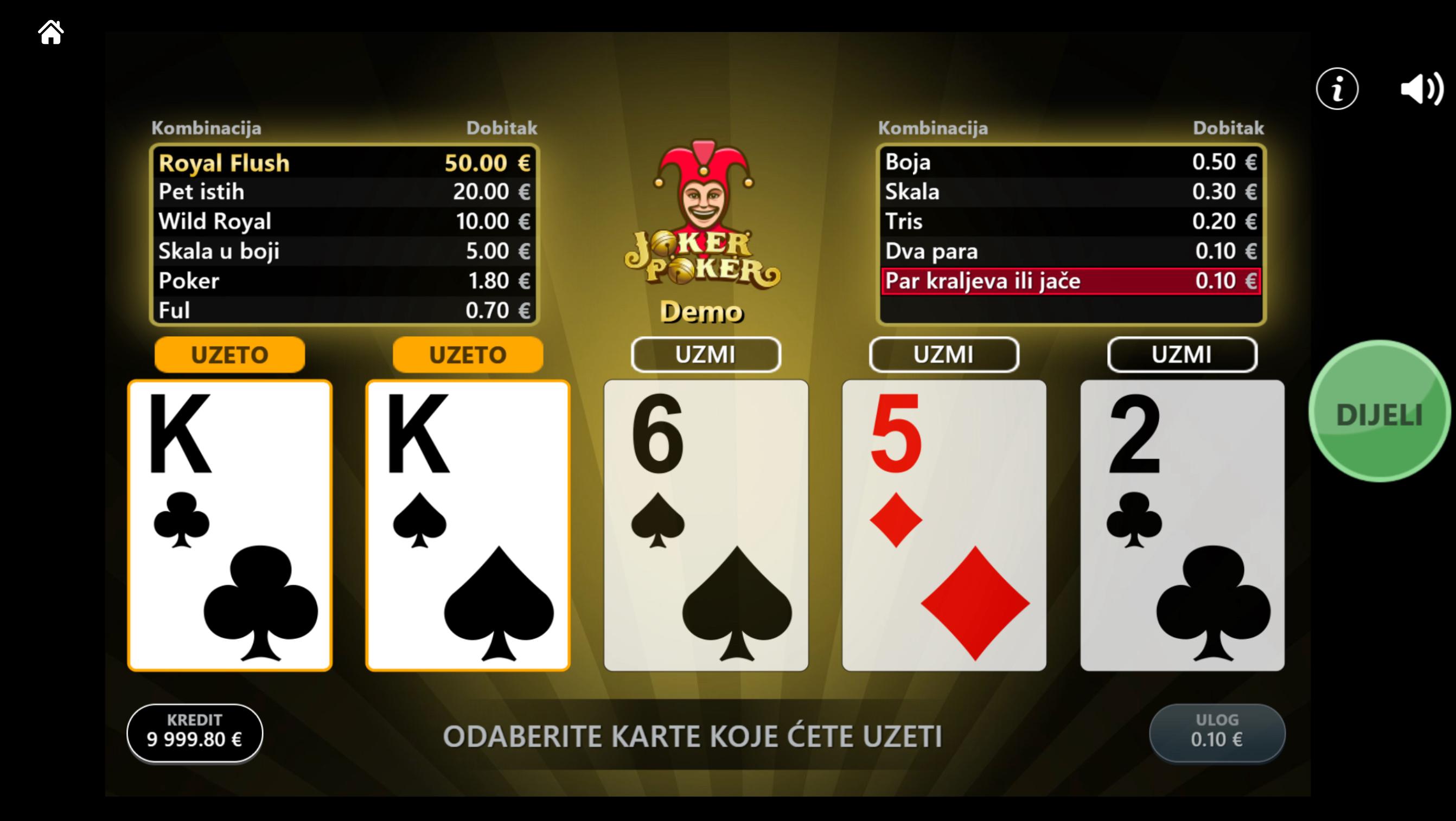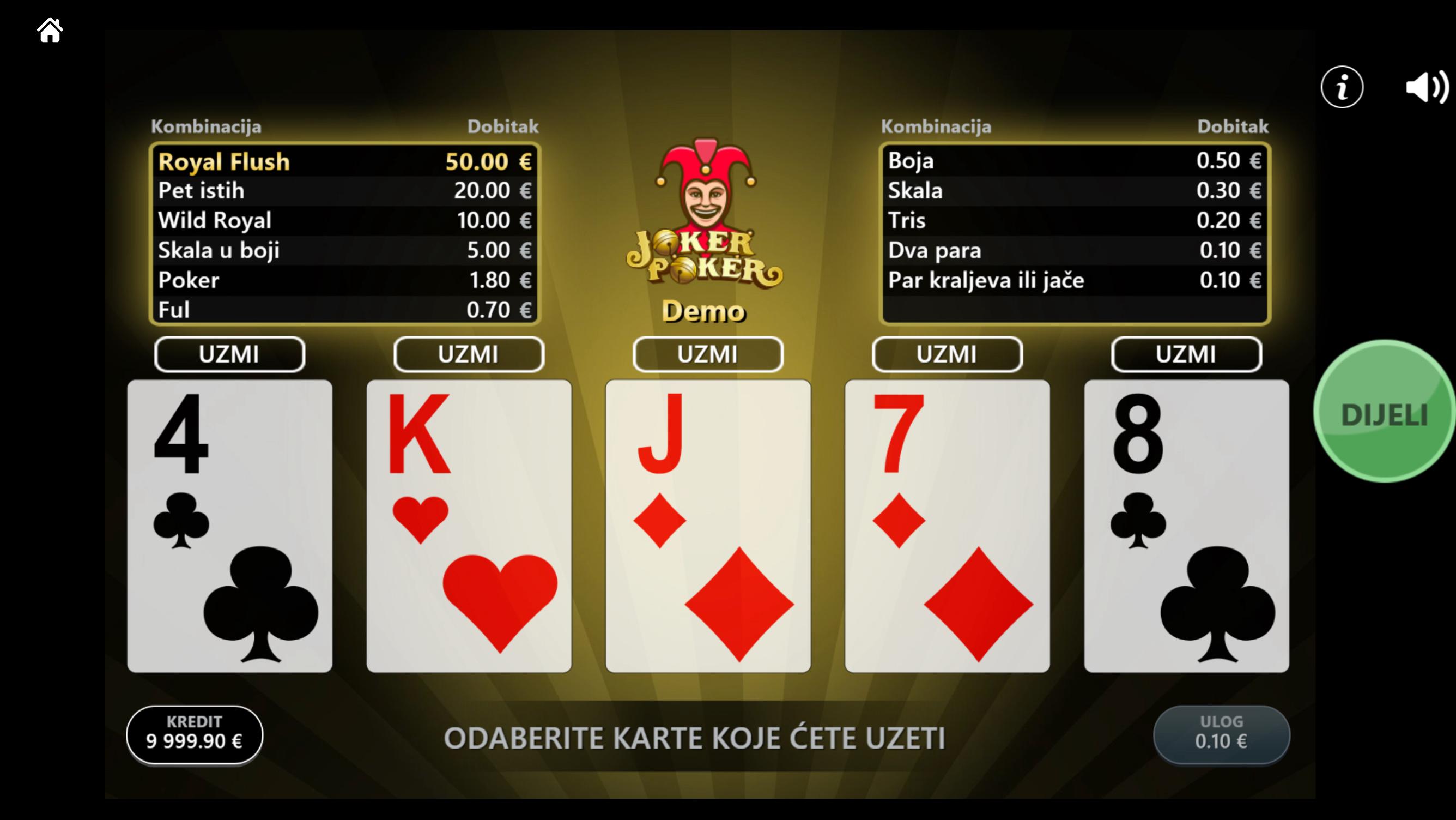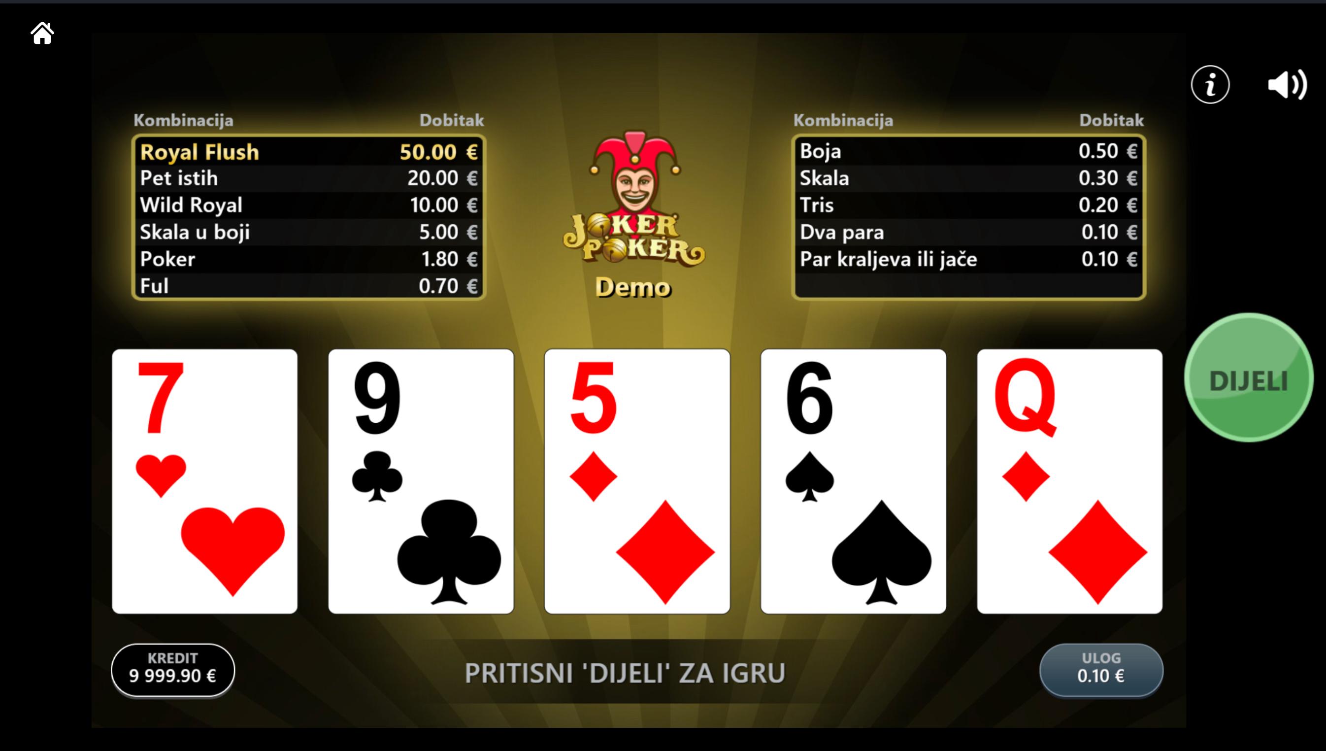 Joker Poker je video poker igra u kojoj se koristi standardni špil od 52 karte plus dodatni joker koji služi kao wild simbol. To znači da joker može zamijeniti bilo koju drugu kartu kako bi pomogao formirati jaču dobitnu kombinaciju. Igra spaja klasične poker ruke kao što su parovi, triling, full, flush, straight, a joker omogućava dodatne mogućnosti poput „five of a kind“ u nekim varijantama. Dizajn igre je jednostavan i funkcionalan, fokusiran na karte, čist prikaz i pregledne kontrole.