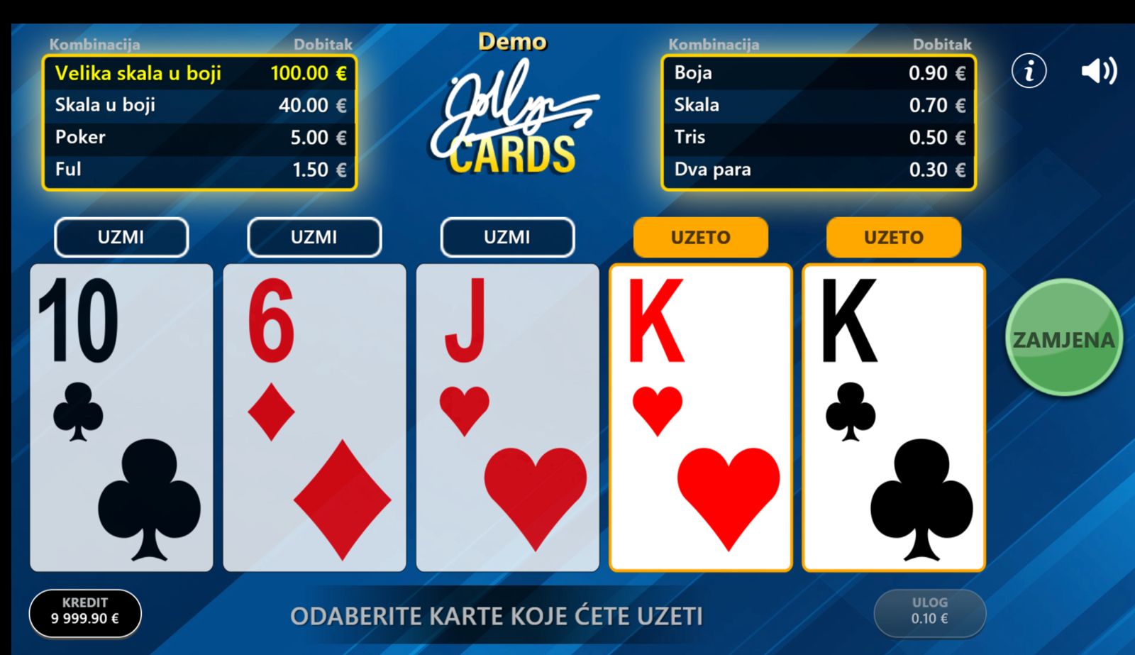 JOLLY CARDS se temelji na brzom formiranju kartaških kombinacija. Nakon odabira uloga igra odmah počinje — cilj je složiti što vrijedniju kombinaciju i ostvariti isplatu. Svaka runda je kratka, jasna i bez komplikacija, što omogućuje brzu igru i nizanje više pokušaja u kratkom vremenu. Minimalni ulog je 0,10 €, a maksimalni 100,00 €, što dopušta fleksibilan stil igre — od opreznijeg do visokorizičnog. Igra nema besplatnih vrtnji, bonus rundi ni jackpot, fokusirajući se isključivo na jednostavnost i brze rezultate.