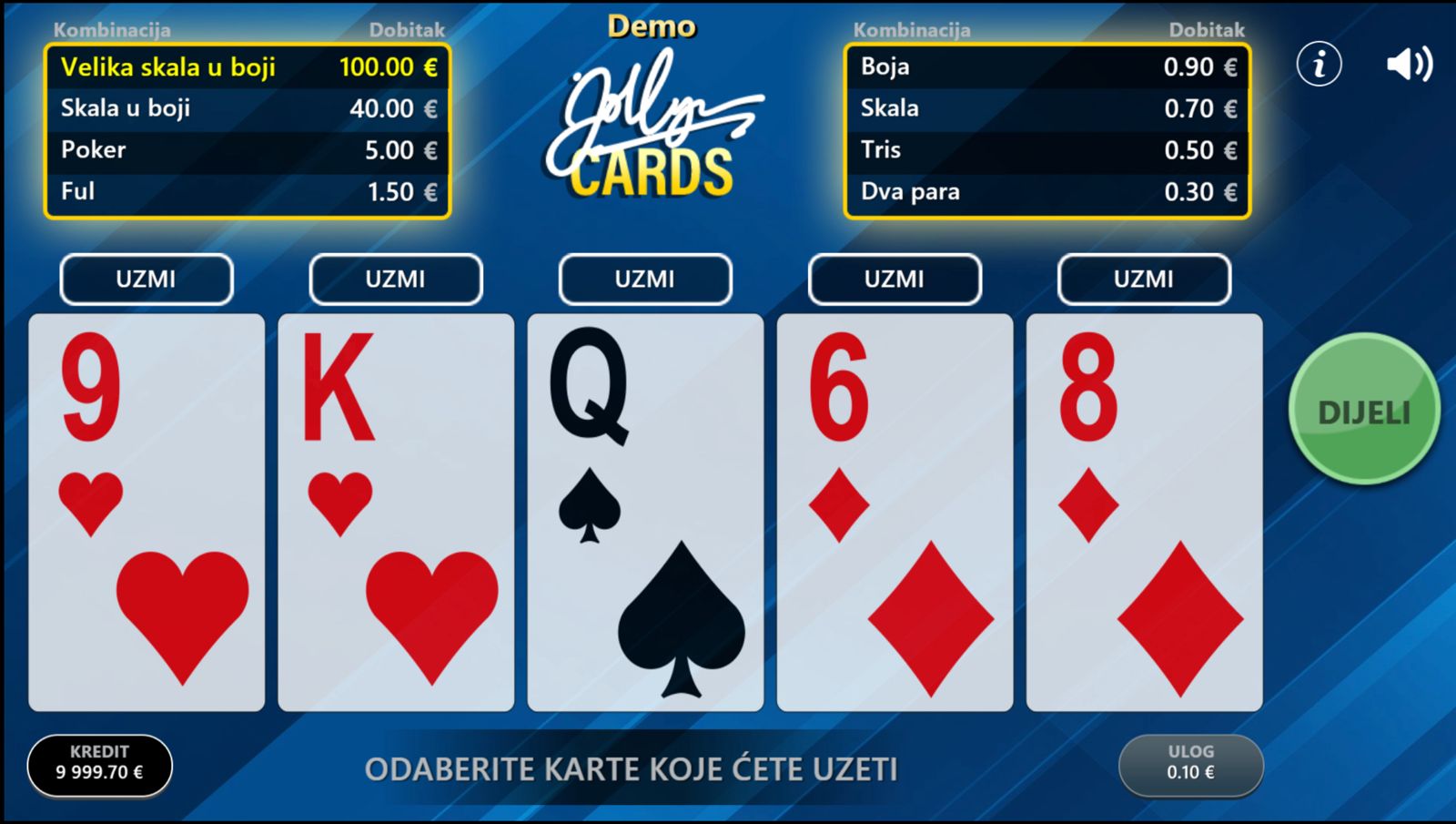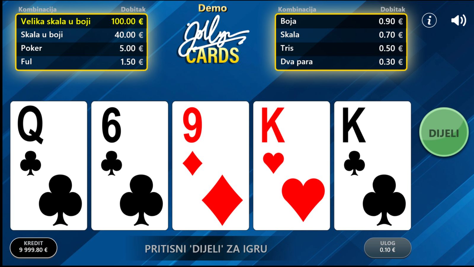 Dobrodošli u dinamičan svijet brze akcije i jednostavnih pravila! JOLLY CARDS dolazi od providera XGames i predstavlja modernu kartašku igru u kojoj je cilj složiti dobitne kombinacije i uhvatiti što bolji ishod u što kraćem vremenu. Minimalni ulog iznosi 0,10 €, dok maksimalni doseže 100,00 €, što igru čini pristupačnom početnicima, ali i privlačnom iskusnim igračima. Igra nema jackpot, ali svaki odigrani krug nosi mogućnost iznenadnog dobitka. Ako voliš igre koje nude instant rezultate, jasna pravila i brzu napetost — JOLLY CARDS je idealna igra za tebe!