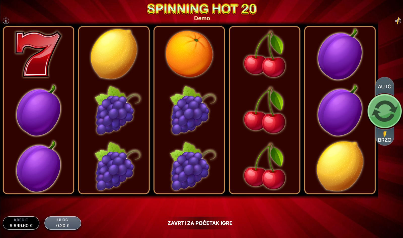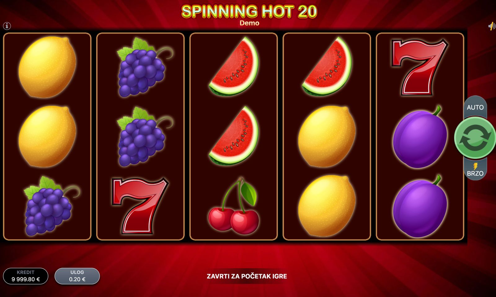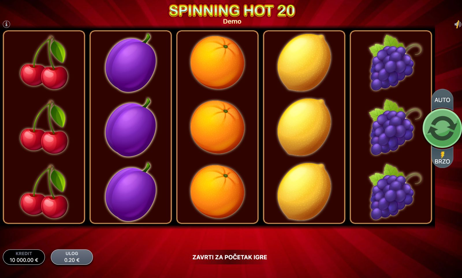 SPINNING HOT 20 igra se na klasičnoj slot mreži s 20 aktivnih linija. Cilj je spojiti iste simbole na jednoj od linija kako bi se ostvario dobitak. Simboli sedmica i zvona donose veće nagrade, dok voćkice održavaju ritam igre. Minimalni ulog je 0,20 €, a maksimalni 100,00 €, što omogućuje igru prilagođenu svakom budžetu. Igra nema besplatnih vrtnji, bonus značajki ni jackpot — fokus je na čistom, klasičnom slot iskustvu s brzim rezultatima.