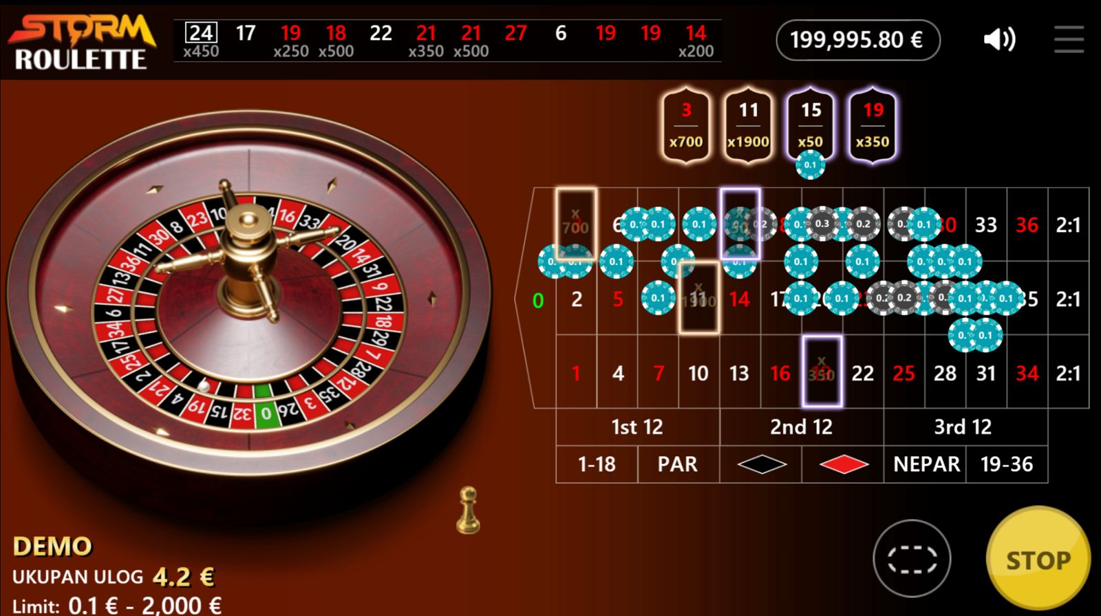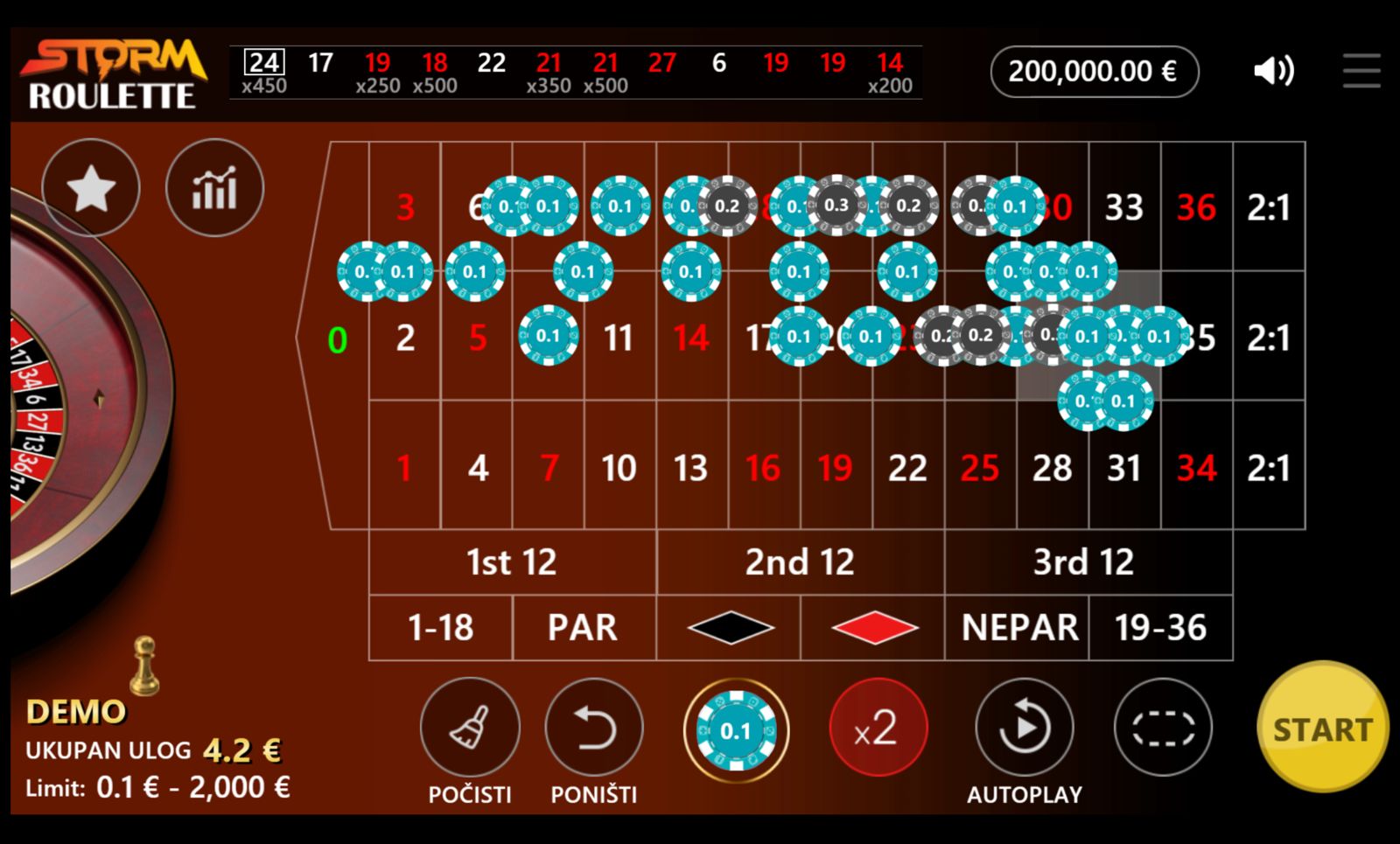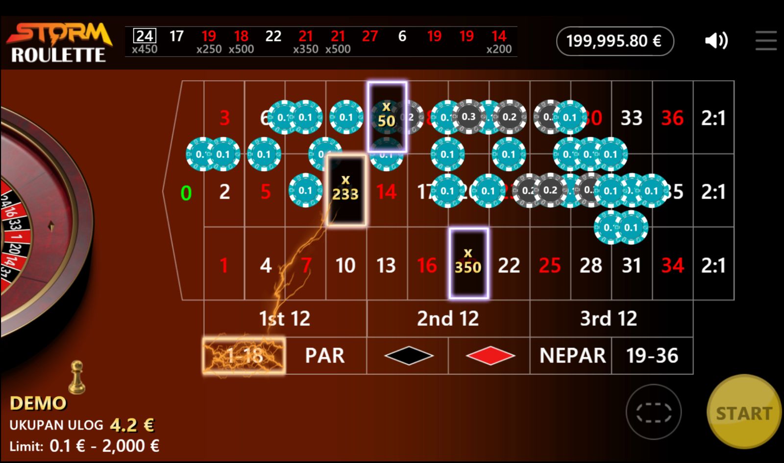 Dobrodošli u svijet brzog i uzbudljivog online ruleta! STORM ROULETTE dolazi od providera XGames i donosi elegantno i intuitivno rulet iskustvo za sve vrste igrača. Minimalni ulog iznosi 0,10 €, dok maksimalni iznosi 2.000,00 €, što igru čini pogodnom za početnike i high roller igrače. STORM ROULETTE nema jackpot, ali svaki spin kotača pruža priliku za značajne dobitke i neizvjesnost svakog okretaja. Ako voliš igre koje spajaju strategiju, napetost i klasičnu eleganciju, STORM ROULETTE je pravi izbor za tebe!