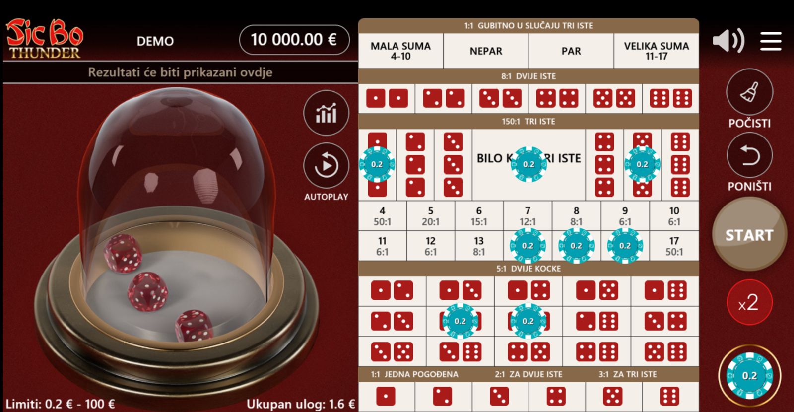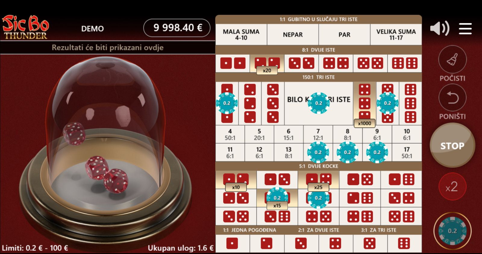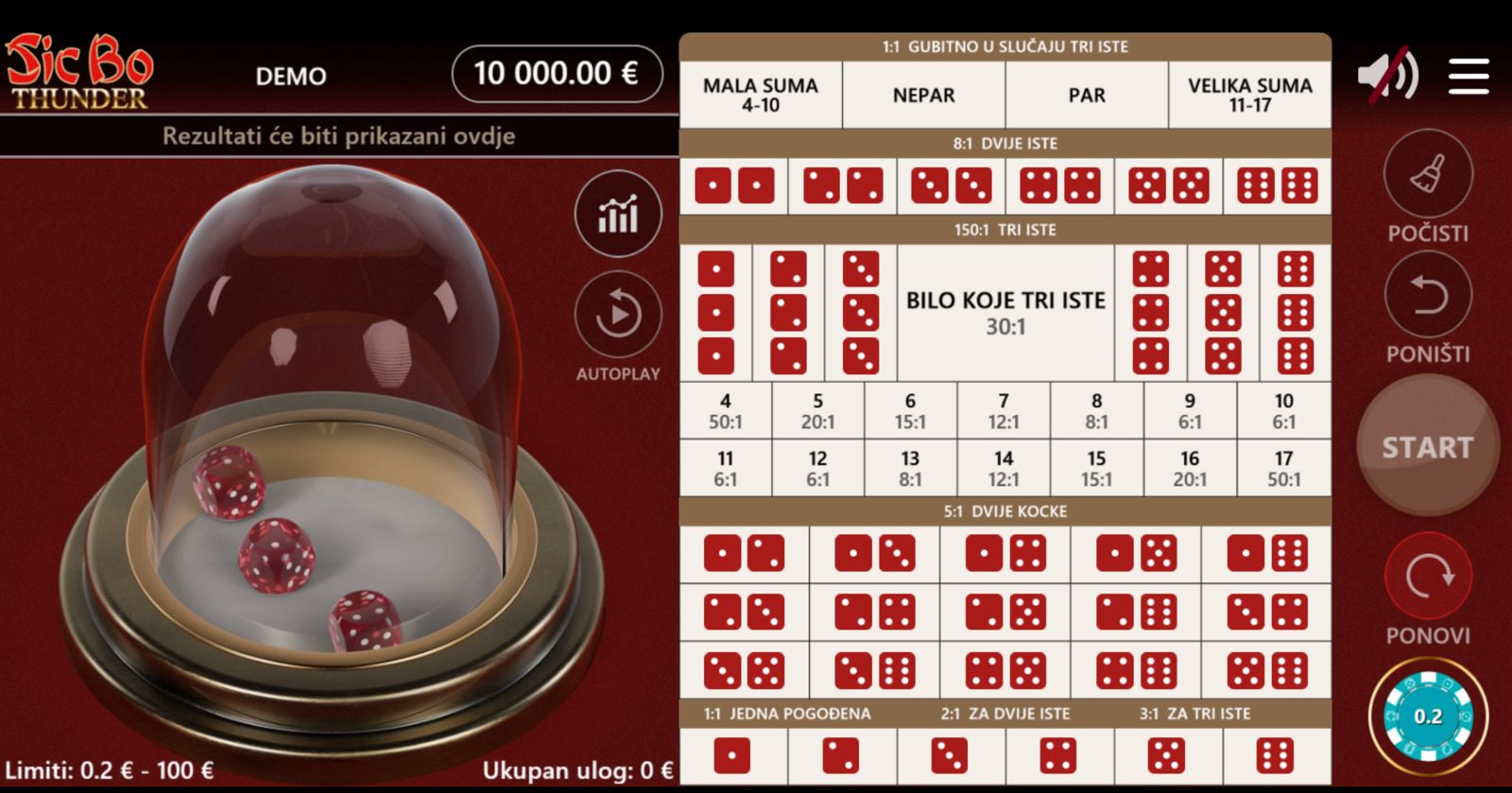 Dobrodošli u svijet brzih i uzbudljivih brojeva! THUNDER SICBO dolazi od providera XGames i donosi klasičnu Sic Bo igru u modernom online izdanju. Minimalni ulog iznosi 0,20 €, dok maksimalni iznosi 100,00 €, što igru čini pogodnom za igrače s različitim stilovima i budžetima. THUNDER SICBO nema jackpot, ali svaka runda može donijeti visoke dobitke zahvaljujući različitim tipovima uloga i multiplikatorima. Ako voliš igre koje spajaju sreću, strategiju i brzu akciju, THUNDER SICBO je pravi izbor za tebe!